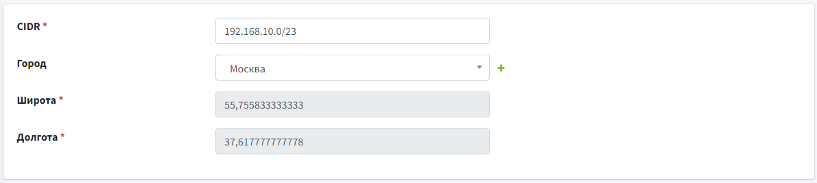 CIDR— указание значения метода разбиения IP-адресного пространства на подсетиГород— указание городаШирота— указание широты подсетиДолгота— указание долготы подсети
