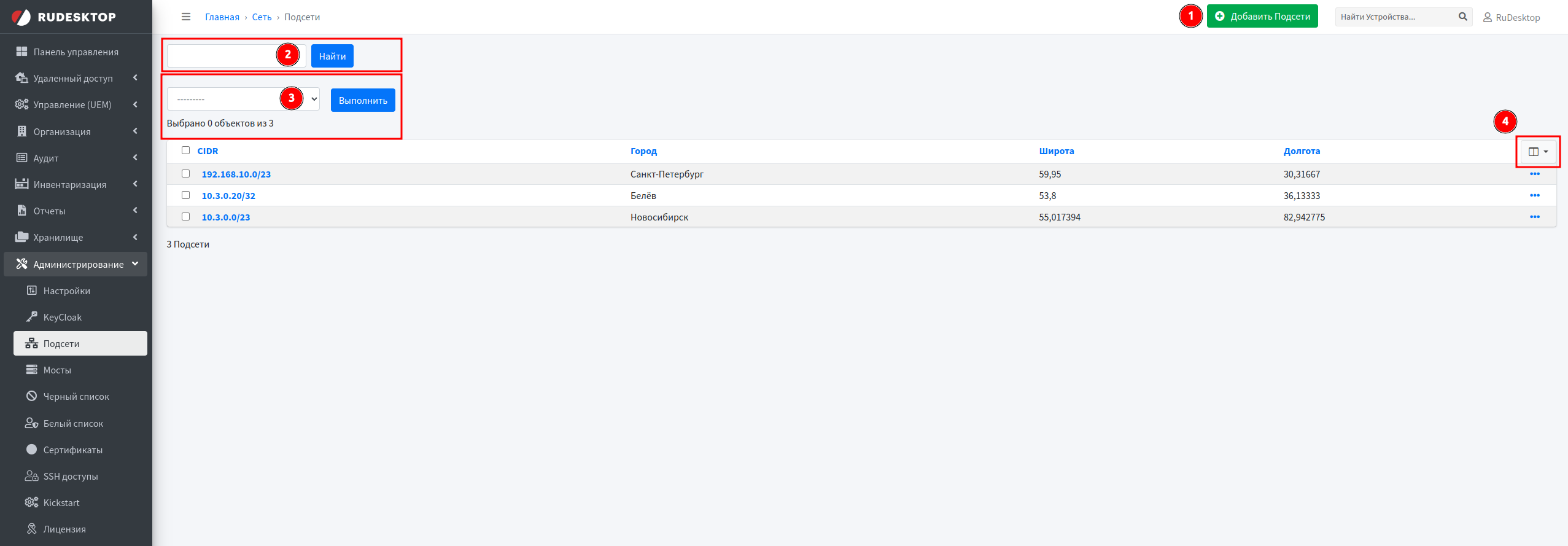 Подсети — страница предназначена для создания подсетей, чтобы устройства, подключенные к серверу, получали геопозицию через подсеть