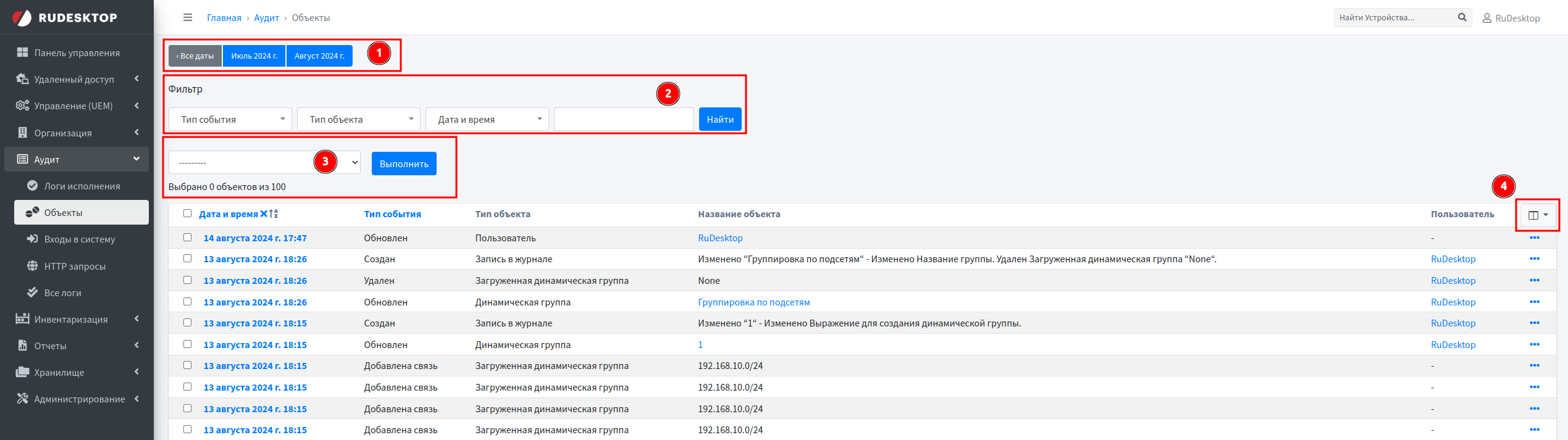 Объекты — на данной странице отображены события по добавлению, изменению или удалению объектов на различных страницах