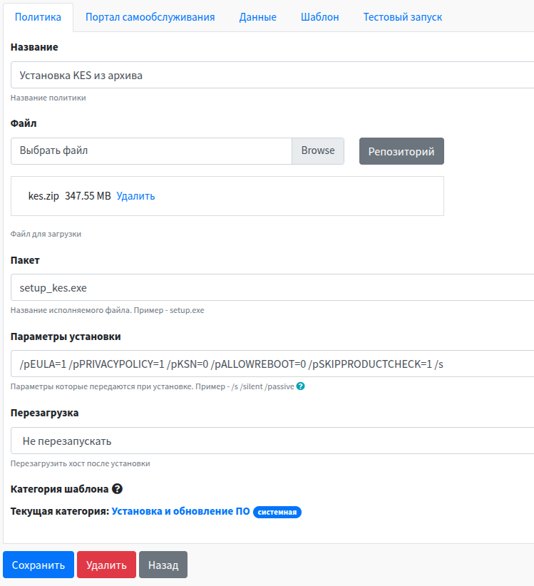 Выбрать шаблон политики Установка пакета из архива из списка предложенных шаблонов