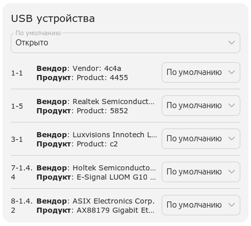 Эта настройка позволяет по умолчанию определять видимость и доступность USB-устройств для проброса