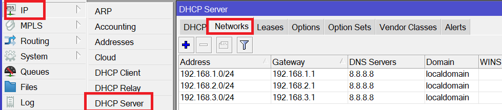 /ip dhcp-server network add address=192.168.1.0/24 gateway=192.168.1.1 dns-server=8.8.8.8 domain=localdomain /ip dhcp-server network add address=192.168.2.0/24 gateway=192.168.2.1 dns-server=8.8.8.8 domain=localdomain /ip dhcp-server network add address=192.168.3.0/24 gateway=192.168.3.1 dns-server=8.8.8.8 domain=localdomain