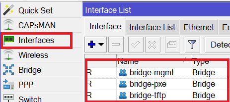 /interface bridge add name=bridge-mgmt /interface bridge add name=bridge-tftp /interface bridge add name=bridge-pxe