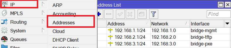 /ip address add address=192.168.1.1/24 interface=bridge-mgmt /ip address add address=192.168.2.1/24 interface=bridge-tftp /ip address add address=192.168.3.1/24 interface=bridge-pxe