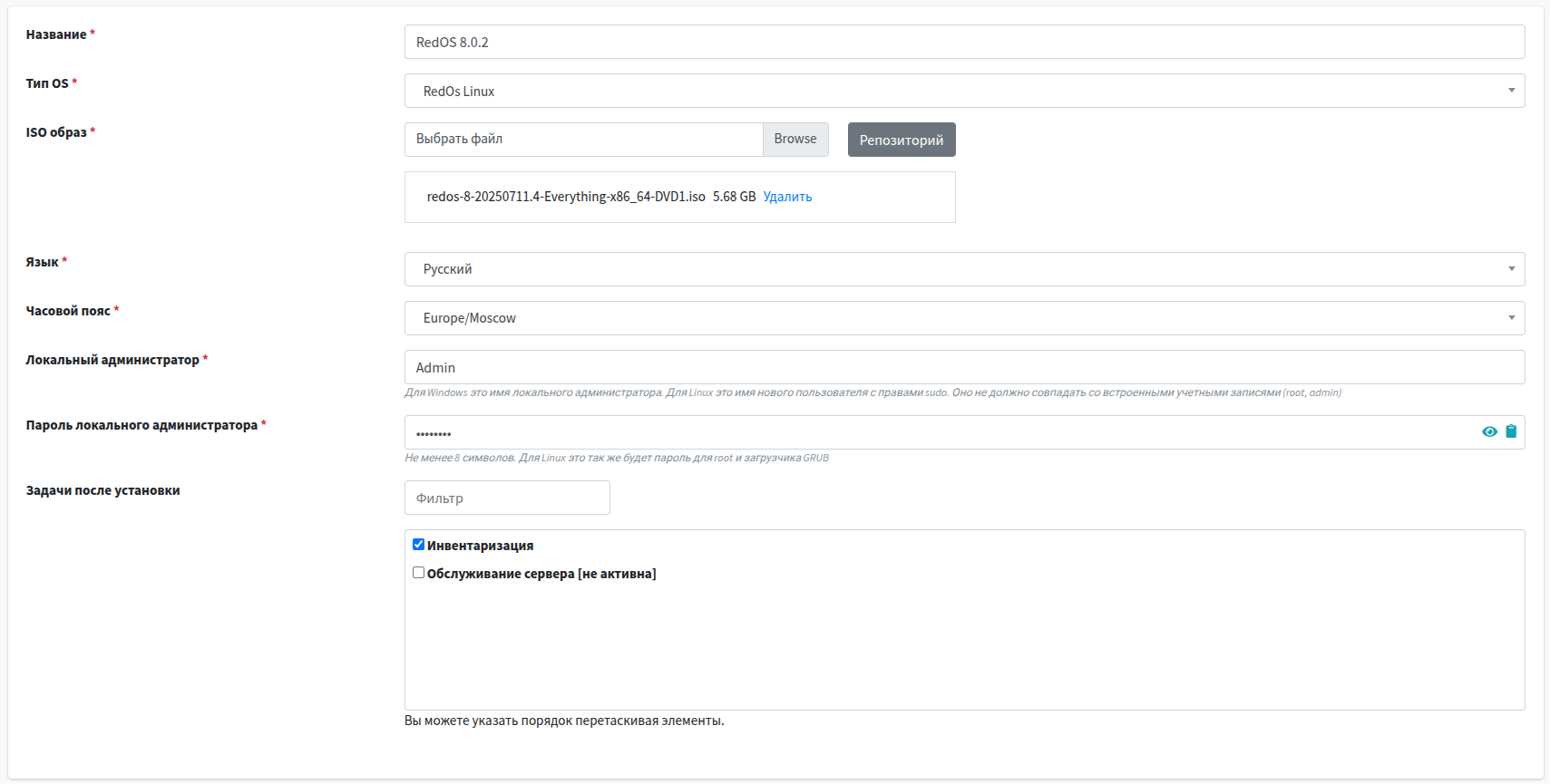 Локальный администратор — имя пользователя локального администратора (будет создан при установке ОС на удаленное устройство)